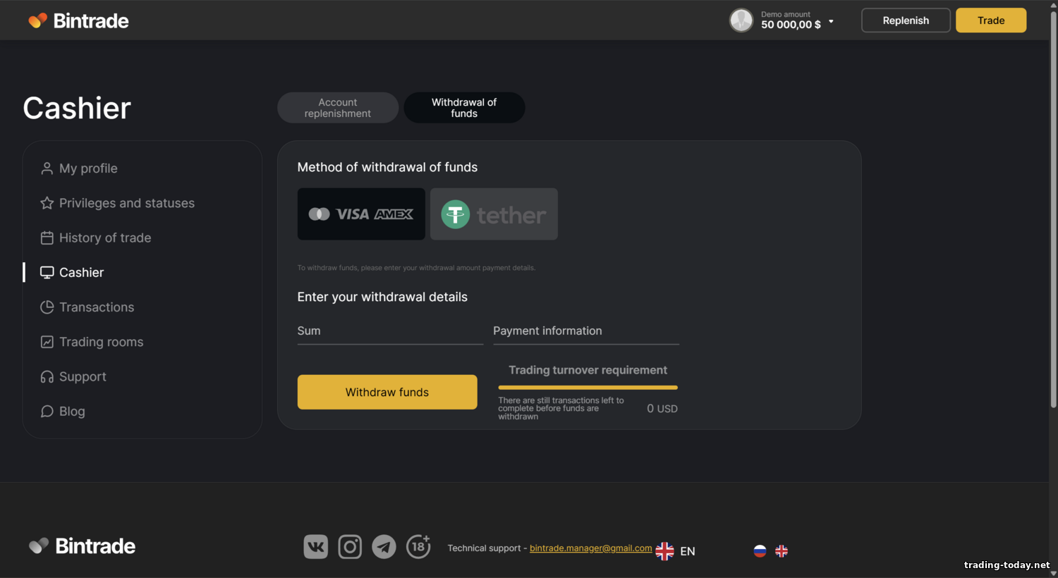 - Withdrawal fees. BinTrade says it doesn’t charge a withdrawal fee (0%). If you request 5,000 ₽, you should receive that amount in full. However, e-wallets and banks may charge for incoming transfers or currency conversion. For example, if the broker pays in rubles but your card account is in dollars, your bank will convert at its rate.