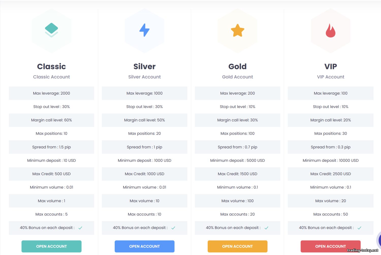 - Account types and trading conditions