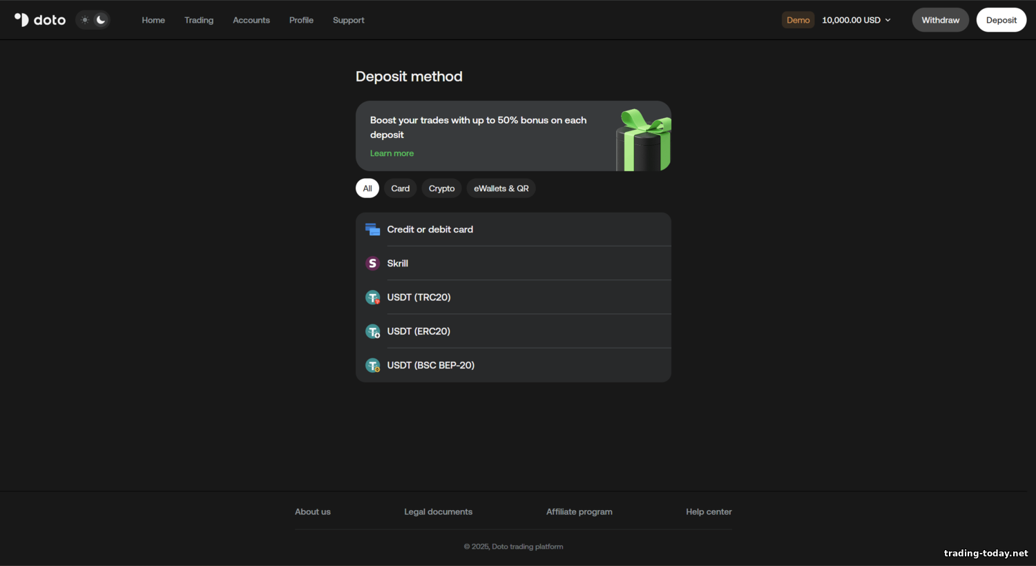 - Bonuses and promotions: Trading conditions usually exclude bonuses, but Doto sometimes offers a deposit bonus. Currently the site advertises a “deposit bonus up to 50 %” of the deposit amount. Deposit $100 and get +\$50 bonus credit, so your trading balance becomes \$150. The bonus lets you open larger trades but cannot be withdrawn until certain turnover is met. Doto had not offered bonuses before, yet competition pushes many offshore brokers to give 30–100 % bonuses, so Doto followed suit. Treat bonuses with care: they raise leverage and impose conditions. Read the bonus agreement before accepting. Still, their presence can please traders who enjoy such programs.