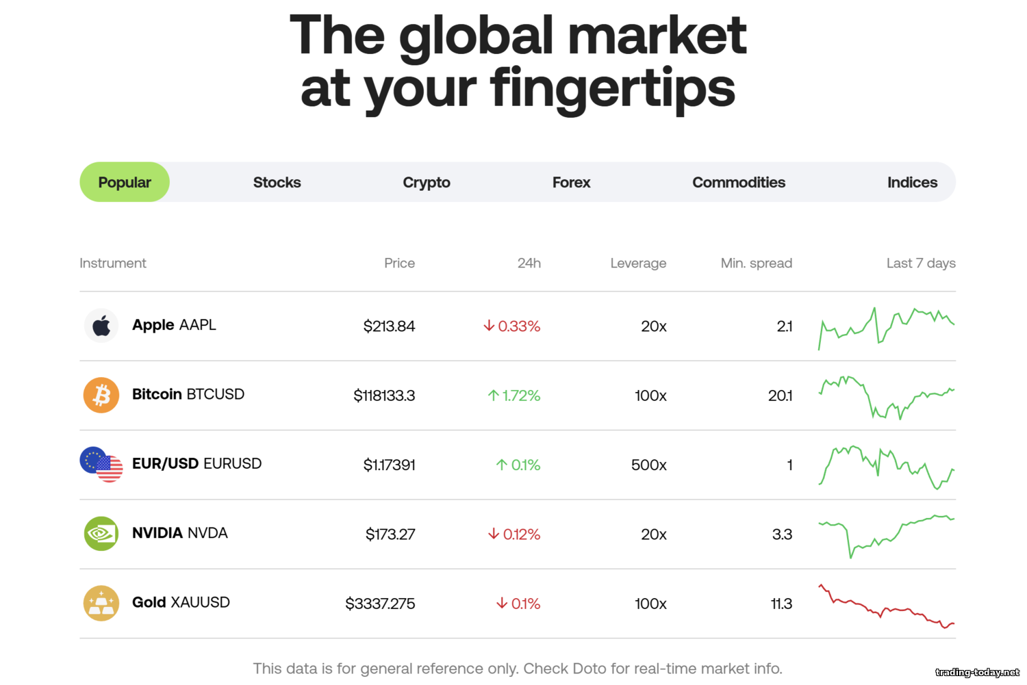 - Forex: You can trade 81 currency pairs, including all the majors (EUR/USD, GBP/USD, USD/JPY, etc.), most popular crosses (EUR/GBP, AUD/JPY and so on) and a selection of exotics from emerging-market currencies. Doto’s leverage on Forex reaches up to 1:500 for major and some minor pairs, allowing you to control sizeable volumes with a modest margin (remember: higher leverage equals higher risk). Exotic pairs are usually capped at 1:100 due to their greater volatility. Spreads on the majors are floating, starting from roughly 1.2 pips on EUR/USD in calm conditions. All pairs trade 24 hours a day, five days a week (the Forex market closes for the weekend).