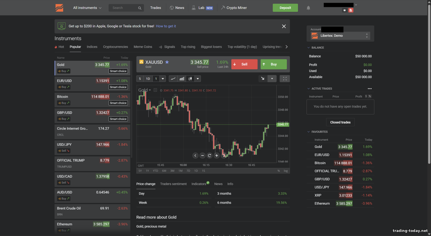 - Stocks: about 100–103 stock CFDs. In Libertex you can trade shares of major US corporations (Apple, Amazon, Tesla, Google, Facebook, etc.) plus European and Asian names. These are CFDs, so you speculate on price moves rather than receive dividends directly (cash adjustments reflect dividends). Note: Libertex also offers investing in real stocks with zero commission — a relatively new product. When you buy stocks without leverage via Libertex, you purchase the underlying asset in your name. That brings Forex Club closer to multi‑asset online brokers like eToro, letting you combine CFD trading with investing.