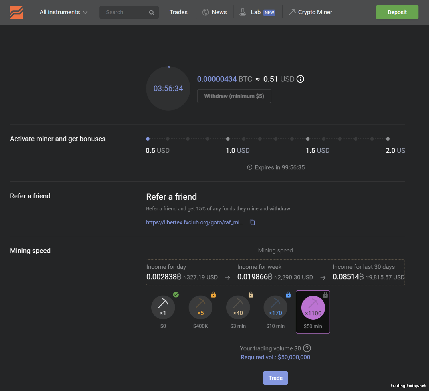 - Libertex Account. This account is for trading through the Libertex platform. Features: zero spreads (0.0 pips) across instruments and a per‑trade commission. The fee is very low — about 0.03% of trade value (varies by asset). For example, buying EUR/USD for $1,000 costs about $0.30. In pip terms that’s around 0.1 pip — cheaper than most competitors’ spreads. There’s effectively no minimum deposit — you can start from $1, which attracts many beginners. Leverage (via the multiplier) is up to 1:500 on FX pairs. Orders execute at market prices (Market Execution) nearly instantly. Also, Libertex doesn’t add conventional swaps directly — overnight costs are embedded if you hold beyond a day. This account is ideal for those who want simplicity and transparency: you always see the exact commission before confirming a trade, with no hidden charges. Note that Libertex accounts often receive bonuses — e.g., a welcome deposit bonus (see below).