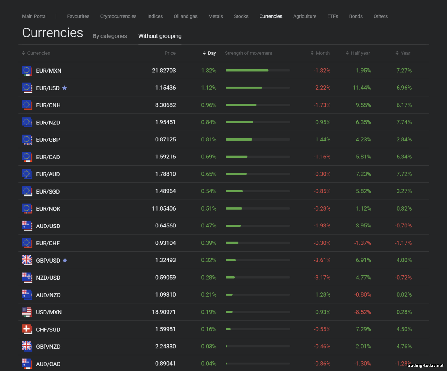 - Currency pairs (Forex): about 50–54 pairs — all majors (EUR/USD, GBP/USD, USD/JPY, etc.), crosses (EUR/GBP, AUD/JPY, etc.), and a set of exotics (USD/TRY, USD/ZAR). G10 currencies are covered, popular RUB pairs (EUR/RUB, USD/RUB) for CIS, and some Asian pairs. FX spreads are minimal and liquidity high through the broker’s LPs.