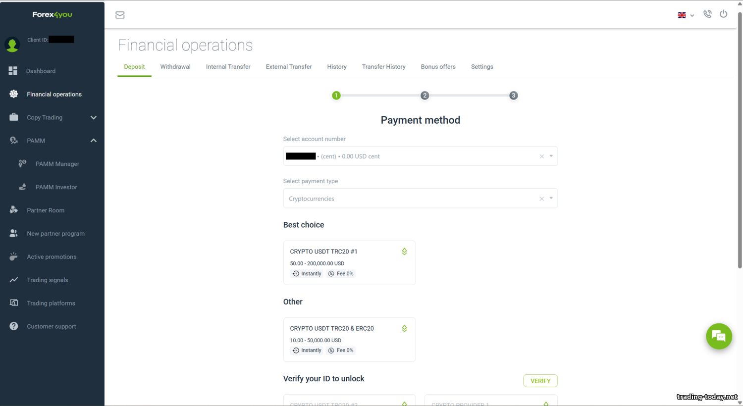 Forex4you supports a wide range of deposit options to fit regional preferences. Visa/Mastercard, bank wire (SWIFT), e‑wallets, and even crypto are available. Among e‑wallets: Skrill, Neteller, WebMoney, QIWI, YooMoney, FasaPay, Perfect Money, etc. For example, WebMoney or Skrill deposits are instant; minimum $1; broker fee 0%. Cards typically have a $10–20 minimum; funds credit instantly or within an hour; broker fee 0% (your bank may take ~2.5%). Local payment rails are available in certain regions: local banks in SE Asia, online banking in India, and regional services in Latin America. The cabinet shows the full list for your country. All payments are protected (SSL); the account currency is usually USD; other currencies are converted at system rates. With no formal minimum deposit — even $1 — the broker is appealing to beginners.