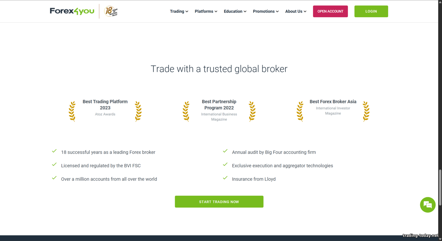 Key facts about Forex4you: the broker is incorporated in the British Virgin Islands and holds a BVI FSC license (offshore regulator). Over 17+ years it has opened 2.9M+ trading accounts and attracted 52K+ partners globally. In 2013 the company launched Share4you, a copy‑trading service that lets newcomers automatically mirror trades of experienced leaders. Forex4you sets no entry threshold — you can start with as little as $1. Officially, the broker offers 150+ instruments (FX pairs, stocks, indices, commodities) and leverage up to 1:4000. The company undergoes annual Big Four audits (KPMG), states full segregation of client funds, and mentions Lloyd’s insurance. Below we cover everything — from account types and spreads to client reviews.