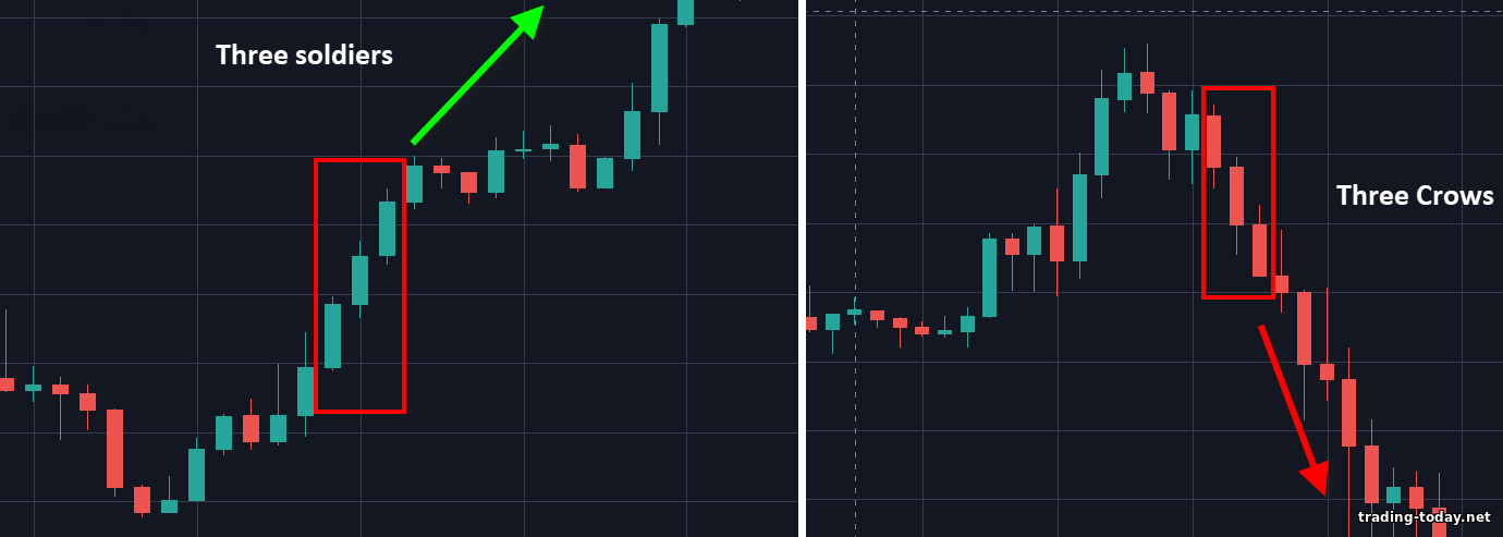 Similar to candlestick reversal patterns, there are also trend continuation patterns - they also consist of Japanese candlestick formations and indicate the presence of strong and stable price movements.Three soldiers and three ravens - three Japanese trend continuation candles