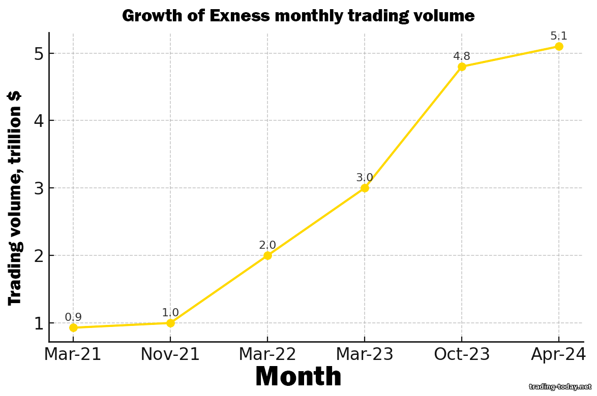 Exness monthly trading volume growth (in trillions of USD), showing the broker’s rapid expansion from 2021 to 2024.