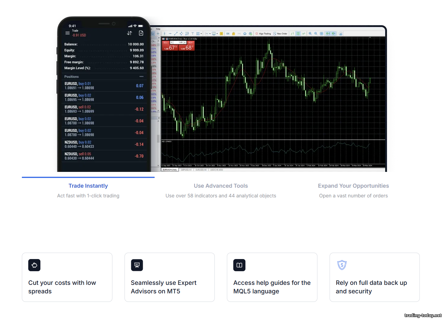 | Order execution | Market Execution (market fills), no requotes; 99% of orders < 1s |