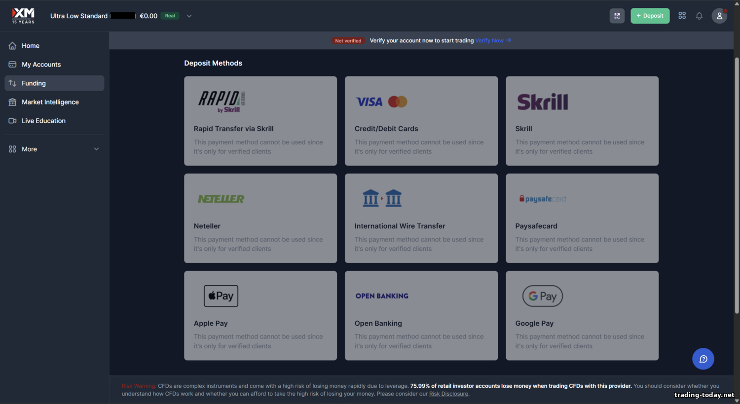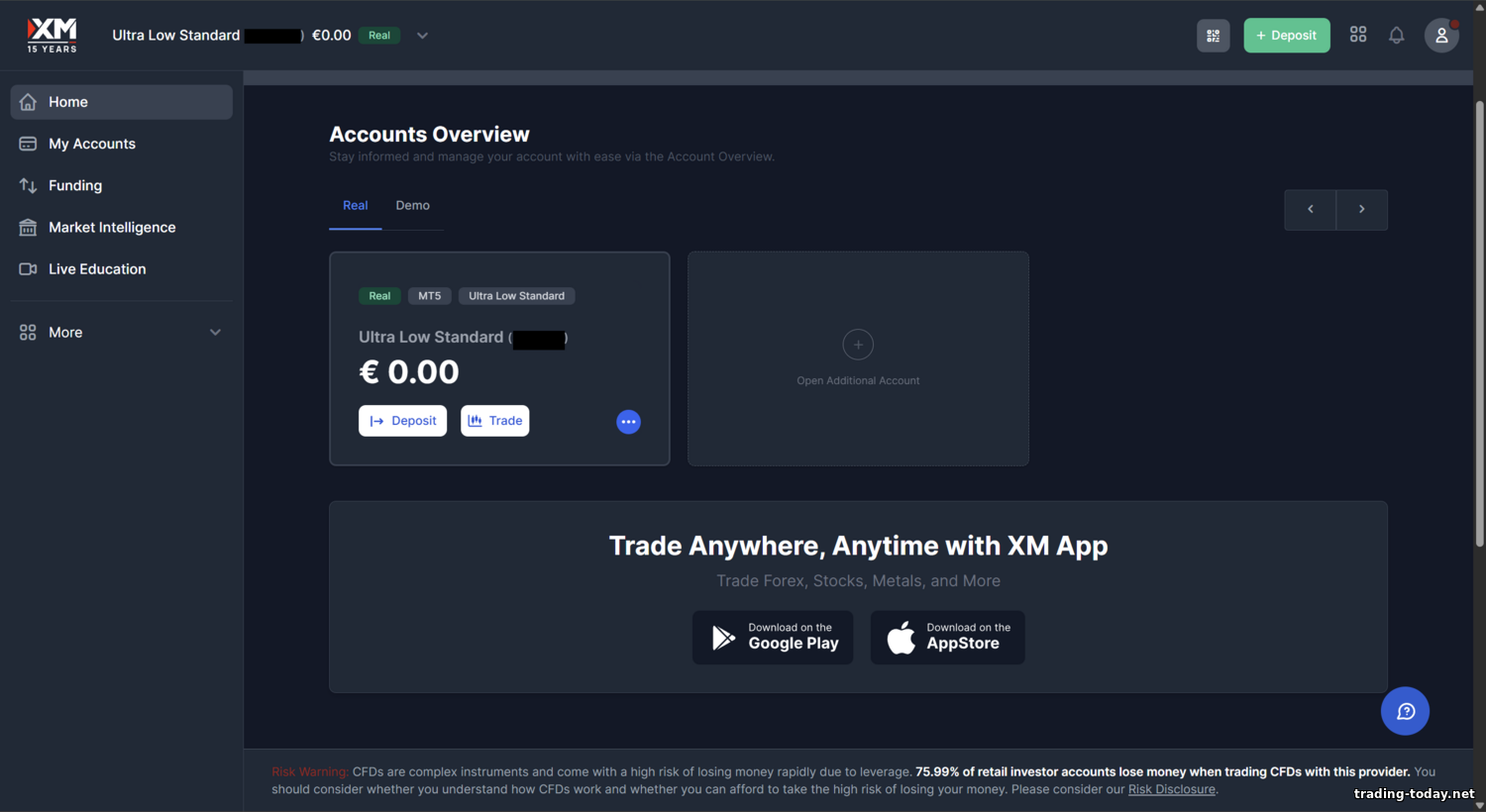 - XM Zero Account: minimal spreads from 0.0 with a fixed commission. Historically XM charged $3.5 per 100k per side (i.e., $7 per full‑lot round turn). Spreads on majors: ~0.0–0.3 pips (near interbank). XM Zero isn’t available in all jurisdictions; in some regions Ultra Low replaces it. If Zero is offered for your region, it suits advanced traders who want the thinnest possible spread. Minimum deposit is also $5; leverage up to 1:500 (previously limited). For precious metals XM does not charge commission even on Zero — e.g., gold can be traded with a ~$0.2 spread and no extra fee. Note: XM doesn’t always publish average Zero spreads publicly (a transparency gap flagged by some reviewers), so many opt for Ultra Low as a simple no‑commission alternative.